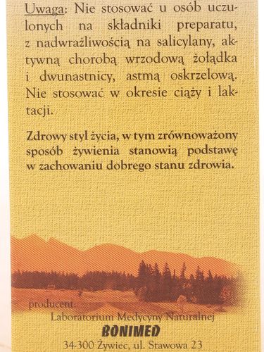| | | | Składniki: |  | ekstrakt z kory wierzby, ekstrakt z kwiatostanu lipy, żelatyna, maltodekstryna, substancje przeciwzbrylające (sole magnezowe kwasów tłuszczowych*, dwutlenek krzemu). *) pochodzenia naturalnego