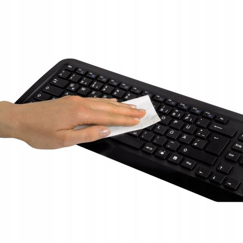 "Chusteczki czyszczące" to 100 nietkanych tkanin polarowych w dozowniku do zewnętrznego czyszczenia plastikowych i metalowych powierzchni skomputeryzowanych urządzeń i urządzeń biurowych. Na przykład we wszystkich klawiaturach, myszach, telefonach lub faksach prędzej czy później są kurz lub odciski palców, które trzeba wyczyścić.