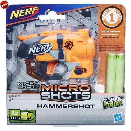 Poznaj swoje ulubione miotacze w nowym, miniaturowym wydaniu! Wyrzutnie mieszczą w sobie po jednej strzałce i wyglądem nawiązują do kultowych już modeli NERF. Wśród nich: Strongarm, Firestrike i Hammershot.