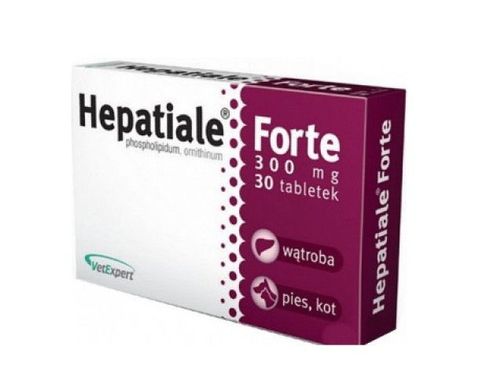 Hepatiale Forte zalecany jest w celu wspomagania funkcji wątroby w przypadkach niewydolno��ci oraz zaburzeń czynnościowych. Fosfolipidy obok kwasów żółciowych odgrywają ważną rolę w trawieniu tłuszczów i wchłanianiu się rozpuszczonych w nich witamin. Hamują procesy włóknienia tkanki wątrobowej poprzez zmniejszenie produkcji kolagenu i zwiększenie rozkładającego go enzymu. Ornityna reguluje cykl mocznikowy, bierze udział w przekształcaniu powstającego z rozkładu aminokwasów amoniaku, zmniejszając jego toksyczność. Szczególną rolę ornityna odgrywa u kotów, które wykorzystują aminokwasy także w procesach wytwarzania energii. Połączenie fosfolipidów i ornityny u psów oraz kotów ma działanie osłonowe i regeneracyjne przy leczeniu chorób wątroby. SKŁADNasiona oleiste, owoce oleiste i ich produkty pochodne. Fosfolipidy (phospholipidum ex soja) zawierające fosfatydylocholinę. DODATKIornityna w postaci L-asparginianu L-ornityny DAWKOWANIE Koty: 1 kapsułka dziennie Psy: 1 kapsułka na 5 kg masy ciała dziennie. Dla osiągnięcia optymalnych efektów zaleca się stosowanie preparatu w okresie od 1 do 3 miesięcy, a w przypadkach przewlekłych – do 6 miesięcy.