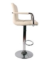 Nowoczesny, stylowy hoker barowy HBD005 wykonany z przyjemnej w dotyku skóry ekologicznej w kolorze jasnego beżu oraz, nadającej ekskluzywnego wyglądu, chromowej nogi zakończonej podstawą typu talerz. Hoker jest w pełni obrotowy oraz posiada funkcję regulacji wysokości.