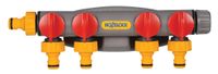 Przyłącze czterodrożne do kranu Hozelock 2150 Umożliwia podłączenie czterech węży, z których dwa mogą być podłączone do elektronicznych dozowników wody (komputerówwodnych). 4-drożna złączka do kranu:- pasuje większość standardowych kranów ogrodowych- tworzy cztery wyloty z pojedynczego kranu- indywidualna kontrola przepływu aż do czterech węży- może być mocowane do ściany w łatwy sposób z pomocą dołączonych śrub i kołków- zawiera 2 złączki do węża i uchwyty do ściany Nr katalogowy2150