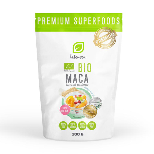 BIO Maca - suplement diety w postaci zmielonego korzenia macy o szerokich właściwościach prozdrowotnych. Jest źródłem witaminy B, B2 oraz B3. Zawiera także wiele minerałów oraz przeciwutleniaczy. Dostarcza również białka pochodzenia roślinnego, węglowodanów oraz sporą ilość błonnika. Jednocześnie podnosi odporność, poprawia libido i wytrzymałość fizyczną oraz usuwa zmęczenie.