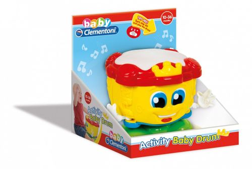 Dziecko może na nim grać, jak na prawdziwym bębenku, obracać nim, naciskać na przycisk w kształcie korony i ruszać rączkami.
