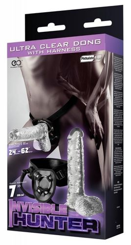 Transparent penis-shaped dildo with testicle and a suction cup. The dildo can be placed in the ring on the black strap-on harness (circumference 60-157 cm). The harness has adjustable straps.