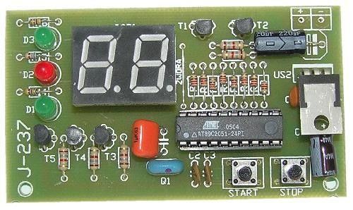 Przyrząd służący do mierzenia czasu reakcji na bodziec zewnętrzny. Zasada działania urządzenia jest prosta: po załączeniu zasilania na wyświetlaczu zostaną wyświetlone poziome kreski, naciśnięcie przycisku start spowoduje rozpoczęcie odliczania i będą na przemian migały dwie diody, po zapaleniu się czerwonej diody należy jak najszybciej przycisnąć przycisk stop. Zwłoka reakcji w setnych sekundy zobrazowana zostanie na 2 cyfrowym wyświetlaczu. Zestaw zbudowany jest na jednej płytce o wymiarach 87x50mm. Układ wymaga zasilania 9...12V