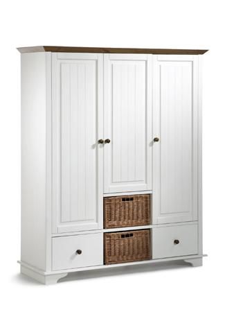 | Materiał: | Drewno sosnowe lite, HDF, biały wosk, metalowe uchwyty, kosze wiklinowe |