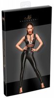 Jumpsuit made out of very stretchy (power) wet look in a shiny matte black look. With transparent powernet inserts over the breasts, on the straps and around the waist. There is an adjustable velvet strap going from the cleavage area right up to the neck. With a zip at the back and a 2-way zip over the crotch. Tight-fitting. 80% polyamide, 20% spandex; powernet 85% polyamide, 15% spandex.