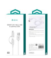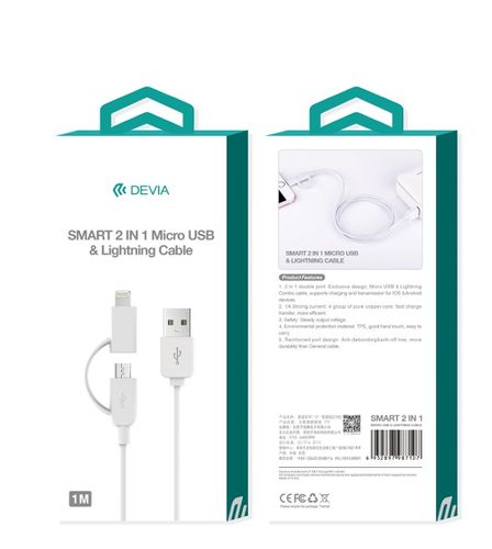 Kabel marki Devia z dwoma końcówkami: micro USB i lightning oraz wejściem USB. Umożliwia ładowanie i transfer danych. Wysoka jakość wykonania z TPE oraz aluminium, z miedzianym rdzeniem w środku. Natężenie 2,4A zapewnia szybkie ładowanie urządzeń.