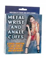 Kajdanki srebrne, metalowe, regulowane, z bezpiecznym otwieraniem. Na ręce i nogi z długim łańcuchem.