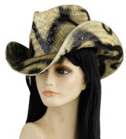 Kapelusz w stylu kowbojskim, słomkowy z czarnym wężowym nadrukiem. Kapelusz wykonany jest z słomkowych pasków powiązanych ze sobą, usztywniony. Wykonany estetycznie i ładnie wykończony. Rozmiar uniwersalny dla dorosłych.