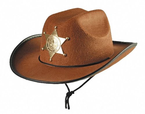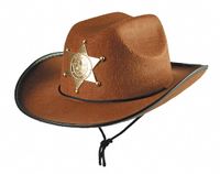 Brązowy kapelusz wykonany z sztywnego filcu, ozdobiony złotą gwiazdą szeryfa, wkoło czarna lamówka. Kapelusz posiada sznurek umozliwiający wiazanie pod szyją.