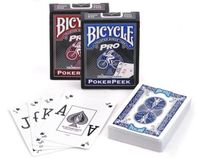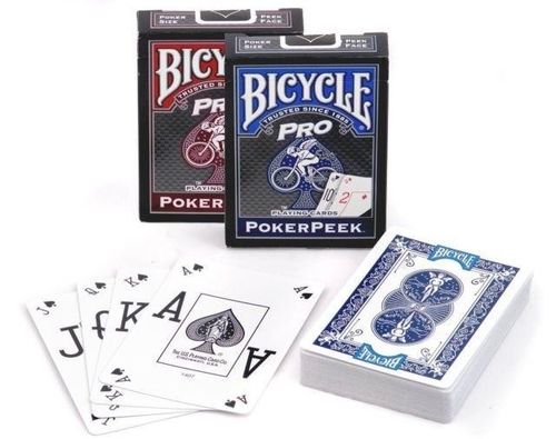 Karty Bicycle ProPeek posiadają podwójny indeks, dzięki któremu sprawdzenie "rozdanej ręki" wymaga minimalnego odgięcia kart. Dzięki temu karty z biegiem czasu nie ulegają nieodwracalnym zniszczeniom i odkształceniom.55 kart w talii.Każda talia wykonana jest z własnego, unikatowego papieru oraz powlekana specjalistycznym tworzywem. Dzięki temu klienci od wielu lat ufają produktom Bicycle.Wyłączną cechą karty Bicycle jest wykończenie kart metodą Air Cushion. Ta sekretna formuła sprawia, że karty Bicycle mają dłuższą żywotność, łatwiej się je tasuje, rozdaje co znacznie uprzyjemnia karcianą rozgrywkę!Wzór wysyłany losowo.
