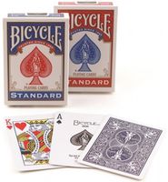 Każda talia wykonana jest z własnego, unikatowego papieru oraz powlekana specjalistycznym tworzywem. Dzięki temu klienci od wielu lat ufają produktom Bicycle. Wyłączną cechą karty Bicycle jest wykończenie kart metodą Air Cushion. Ta sekretna formuła sprawia, że karty Bicycle mają dłuższą żywotność, łatwiej się je tasuje, rozdaje co znacznie uprzyjemnia karcianą rozgrywkę! Standardowe indeksy na przeciwległych narożnikach karty. 52 karty + 2 jokery powlekane plastikiem, Air Cushion Finish. Rozmiar pokerowy (63 x 89 mm). Wyprodukowane we USA przez United States Playing Cards Co. Talia nowa, zapakowana, sygnowana logiem Bicycle. Jeśli w amerykańskim filmie używane są karty do gry to zawsze jest to talia Bicycle Standard.