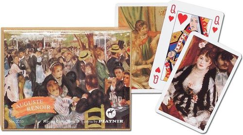 Najwyższej jakości karty do gry renomowanej firmy Ferd. Piatnik & Sohne. W komplecie 2 talie w eleganckim, złoconym pudełku z charakterystyczną Piatnikowską poduszeczką. Na rewersach (koszulkach) i na pudełku obrazy Augustea Renoira. Talie składają się z 55 plastikowanych kart o wymiarach 58 x 89 mm i gramaturze 310. Idealne zarówno do brydża, pokera, remika jak i innych gier. Wyroby wiedeńskiej fabryki Ferd. Piatnik & Sohne od 1824 roku urzekają bogactwem wzorów i perfekcją wykonania. Jakość i tradycja!