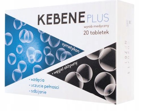 Kebene Plus jest wyrobem medycznym w postaci tabletek, stosowanym w łagodzeniu nieprzyjemnych objawów związanych z połykaniem powietrza i wzdęciami jelit. Jest zalecany do stosowania w objawach związanych z gromadzeniem się gazów. Zmniejsza związany z tym ból i kolkę oraz zapobiega uczuciu pełności i odbijaniu.