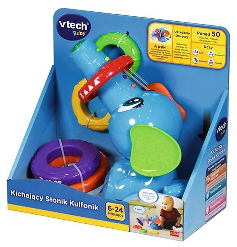 - Posiada wysoko podniesioną trąbę na którą nakłada się kolorowe obręcze. Naciśnij ogonek Słonika, a wszystkie obręcze spadną, gdy Słonik kichnie!