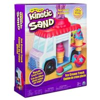 Kinetic Sand Samochód Lodziarnia pozwala z łatwością tworzyć fantastyczne przysmaki. Umieść wafelek w samochodzie, górną część napełnij piaskiem Kinetic Sand, obróć rączkę i patrz, jak piaskowe lody magicznie wirują, wpadając do rożka!