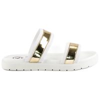 Klapki to jeden z najchętniej wybieranych modeli obuwia letniego. Buty te zapewniają komfort noszenia podczas gorących dni. Klapki Mirror wykonane zostały z wysokiej jakości materiału tekstylnego. Posiadają dwa grube, ozdobione złotymi elementami paski, dzięki którym obuwie trzyma się stabilnie na stopie.