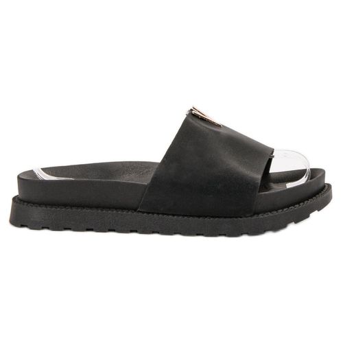 Klapki SHELOVET na 3-centymetrowej platformie to praktyczne buty dla kobiet. Doskonale sprawdzą się one jako obuwie domowe, zapewniając wygodę w czasie codziennego użytkowania. Komfort zwiększy również gumowa podeszwa z bieżnikiem. Jest to obuwie w kolorze czarnym, z ozdobnym wycięciem umieszczonym na pasku.