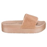 Platformy wcale nie są zarezerwowane dla szpilek, klapki na takich podeszwach również prezentują się niezwykle efektownie. Prezentowane buty w wyjątkowy sposób łączą w sobie walory użytkowe, czyli ponadprzeciętną wygodę, z doskonałym wyglądem. Gwarantuje to piękny złoty kolor i połysk ozdobnych kryształków.