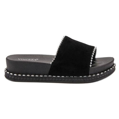Czarne klapki na platformie z kolekcji Vinceza to wygodne i bardzo stylowe obuwie, w sam raz idealne na nadchodzące lato. Gumowa podeszwa zapewnia klapkom bardzo dużą stabilność i bezpieczeństwo w czasie ich noszenia. Platforma obuwia sięga wysokości 4,5 cm, dzięki czemu buty delikatnie wydłużą i wyszczuplą nogi.
