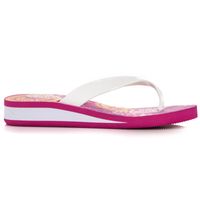 Klapki to obowiązkowe obuwie w sezonie letnim. Doskonale sprawdzą się zarówno na plażę, jak i na basen. Polecane są zwłaszcza w upalne dni. Buty dostępne w barwie różowej z białymi akcentami. Modne, kolorowe akcenty przywodzą na myśl wakacje oraz odpoczynek. Obuwie polecane do codziennego użytkowania.