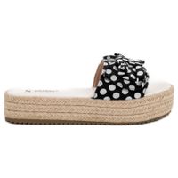 Urocze i kobiece klapki, których niekwestionowaną ozdoba jest szeroki pasek w kropki podtrzymujący stopę. Duża kokarda dopełnia całości. Buty posiadają wysoką na 5,5 cm koturnę z trzema plecionymi, ozdobnymi paskami dodającymi lekkości. Świetnie nadają się do każdej lekkiej stylizacji z sukienką lub z lekkimi spodniami.