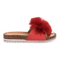 Piękne i szalenie kobiece letnie klapki, na koturnie imitujące naturalny korek o wysokości 3,5 cm, wykonane z wysokiej jakości skóry ekologicznej zamszowej w kolorze pięknej nasyconej koralowej czerwieni, ozdobione za pomocą fantazyjnych pomponów, w odrobinę ciemniejszym odcieniu czerwieni, to buty idealne dla kobiet poszukujących wygodnego obuwia na ciepłe letnie dni.