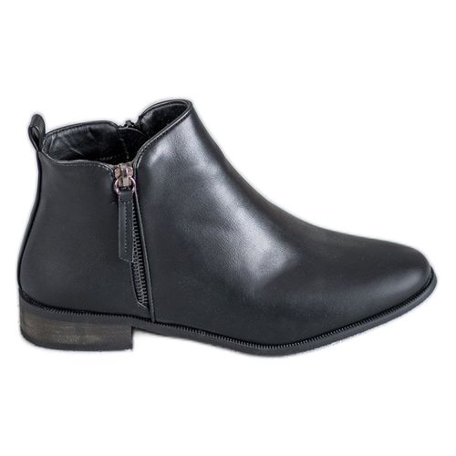 Damskie botki na niskim obcasie, o klasycznym fasonie, w kolorze czarnym. Buty wykonane ze skóry ekologicznej o gładkim wzorze. Obuwie zapinane na suwaki znajdujące się po obu stronach buta. Syntetyczna podeszwa z obcasem o wysokości 2.5 centymetra. W tylnej części ozdobna pętelka ułatwiająca zakładanie butów.