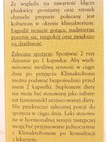 | | Opis produktu: | |  | Szyszki chmielu oraz ekstrakt z kłącza pluskwicy groniastej łagodzą nadmierne pocenie się, uderzenia gorąca, niepokój oraz zwiększoną drażliwość, dlatego preparat polecany jest kobietom w okresie klimakterium.