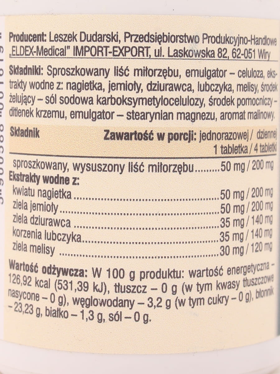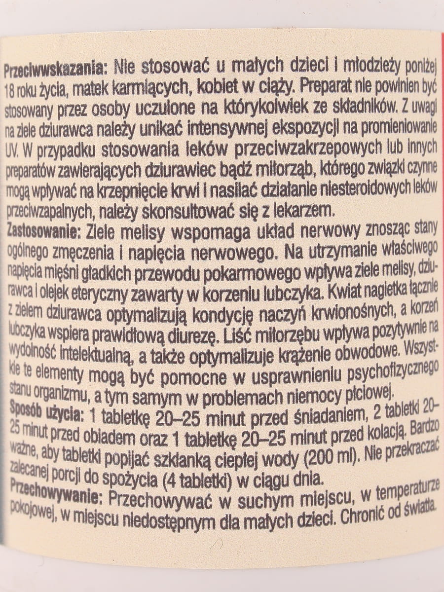 Zawartość w 1 tabletce: sproszkowany, wysuszony liść miłorzębu - 50mg Ekstrakty wodne z: kwiatu nagietka - 50mg ziela jemioły - 50mg ziela dziurawca - 35mg korzenia lubczyka - 35mg ziela melisy - 30mg