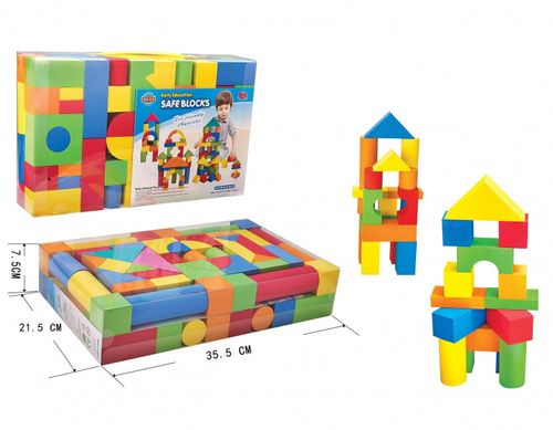 Zestaw zawiera 76 klocków piankowych w różnych kolorach i kształtach , wykonanych z wysokiej jakości pianki. które możemy dowolnie układać, tworząc różne budowle. Zabawa klockami rozwija zdolności manualne i wyobraźnię dziecka.
