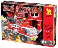 Zestaw umożliwia samodzielne złożenie z klocków wozu strażackiego z remizą strażacką.