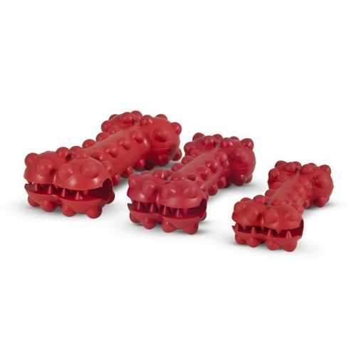 Knobby Dog Bone została zaprojektowana tak, aby jednocześnie psa bawić i zachęcać do zdrowego gryzienia! Kostka jest wykonana z wytrzymałej, nietoksycznej gumy. Na powierzchni kostki są specjalne wypustki/bąbelki masujące dziąsła w trakcie zabawy. Dzięki specjalnym ‘szczękom’, w kostce można umieścić ulubiony smakołyk psa. Guma o smaku kurczaka dodatkowo zachęca psa do żucia kostki.