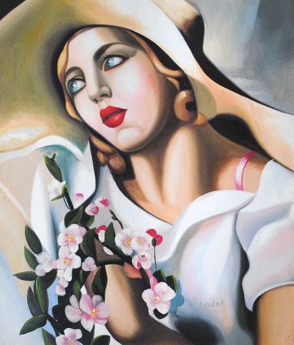 Obraz olejny inspirowany malarstwem Tamary Łempickiej! Praca malarska przedstawiająca postać kobiety. Obraz namalowany w pięknej tonacji kolorystycznej!