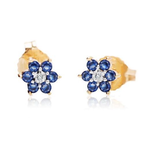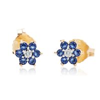 Staviori Kolczyki. 2 Diamenty, szlif brylantowy, masa 0,007 ct., barwa H, czystość I1. 12 Szafirów, masa 0,27 ct.. Żółte Złoto 0,585. Średnica 5,5 mm. Grubość 2 mm.