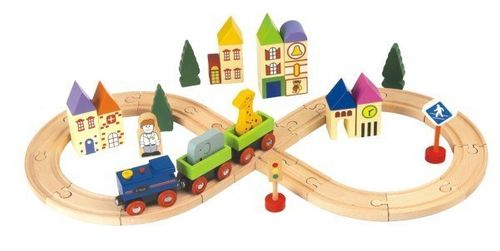 Drewniana Kolejka to zestaw składający się z 45 elementów: stacji kolejowej, lokomotywy i wagonów, które można doczepiać w dowolnej kolejności. Z elementów można zbudować długi tor dla kolejki. Pozostałe elementy stworzą piękny krajobraz wokół torów. Zabawka pomaga w rozwoju kreatywności i zdolności postrzegania przestrzennego oraz rozwija zdolności logicznego myślenia.