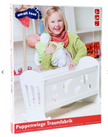 Lakierowana na biało, udekorowana wyciętymi w drewnie motywami serduszek, księżyca i gwiazd kołyska dla lalek, podbije serce każdej małej dziewczynki Wyposażona w materac, poduszkę i kołdrę, zapewnia komfort i wygodę śpiącej w niej laleczce. Z tym ślicznym dodatkiem, zabawa lalkami stanie się jeszcze bardziej interesująca i zajmująca. Mała "mamusia" chętnie ulula do snu swoje "maleństwo"!