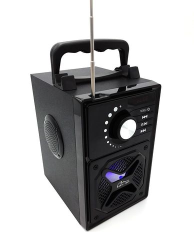 BOOMBOX BT NEXT MT3166 to bezprzewodowy głośnik Bluetooth z wbudowanym subwooferem oraz dwoma głośnikami średnio-tonowymi. Moc chwilowa PMPO wynosi 600W. Aktywny interfejs Bluetooth umożliwia słuchanie muzyki przesłanej bezprzewodowo z urządzenia obsługującego technologię Bluetooth (np. telefon, smartfon, tablet) i swobodne przemieszczanie się bez ograniczenia spowodowanego zbędnymi kablami. BOOMBOX BT NEXT odczytuje pliki muzyczne z kart pamięci microSD oraz z innych nośników danych (np. pendrive). Dzięki wbudowanemu akumulatorowi BOOMBOX BT NEXT jest przenośnym systemem głośników idealnym zarówno do użytku domowego lub biurowego, jak i do używania podczas wszelkiego rodzaju aktywności np. wakacyjnego wyjazdu. Przy pełnym naładowaniu, urządzenie działa nawet do 7 godzin! Nową funkcją jest system DBD (Dual Battery Design) czyli możliwość zamontowania dodatkowego, drugiego akumulatora (brak w zestawie) dzięki czemu można wydatnie wydłużyć czas działania głośnika (zależnie od pojemności akumulatora). Dodatkowe złącze AUX 3,5mm pozwala na podłączenie większości tradycyjnych źródeł dźwięku. Z kolei złącze MIC umożliwia podłączenie kablowego mikrofonu Ważną cechą głośnika MT3166 jest drewniana obudowa, która bez wątpienia wpływa na jakość brzmienia. Wydobywający się dźwięk z głośnika jest niezwykle czysty. Z prawej i lewej strony MT3166 znajdują się dwa głośniki średnio-tonowe. Na panelu przednim znajduje się wyświetlacz informacyjny LED, przyciski sterujące oraz membrana 3-calowego głośnika nisko-tonowego. Z boku obudowy znajduje się port USB, wejście AUX i slot na karty pamięci microSD oraz gniazdo microUSB służące do ładowania. U góry urządzenia znajduje się antena teleskopowa służąca do odbioru stacji radiowych. Znaczącym wyróżnikiem tego głośnika jest solidna rączka zintegrowana z podstawką na smartfona, co pozwala na utworzenie mobilnego zestawu multimedialnego do karaoke czy oglądania filmu. Pod głośnikiem znajdują się cztery antypoślizgowe nóżki dzięki którym głośnik stoi stabilnie. Do zestawu dołączony jest bezprzewodowy pilot sterujący, kabel USB do ładowania głośnika oraz kabel AUX.