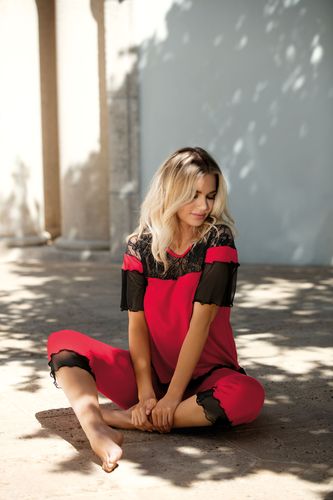 Śliczna, dwuczęściowa piżama Manuela, inspirowana gorącym trendem tego lata - Latino. Kolorystyka (czerwień z czarnymi dodatkami) - wygląda wspaniale. Dekolt, ramiona i rękawki wykonano z miękkiej koronki, najwyższej jakości i doskonale kontrastują z gładką, elastyczną wiskozą. Wygodny fason tworzy bluzeczka z krótkim rękawem, do tego spodnie o długości do okolic kolan, na gumce, wykończone u dołu falbankami. Świetny zestaw na urlop i nie tylko! Skład: 92% wiskoza, 8% elastan.