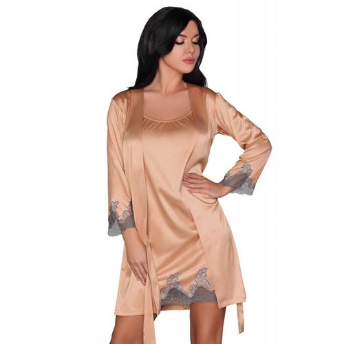 Elegancki, satynowy komplet bielizny Sancha. W skład kompletu, w kolorze beżowym, wchodzi: