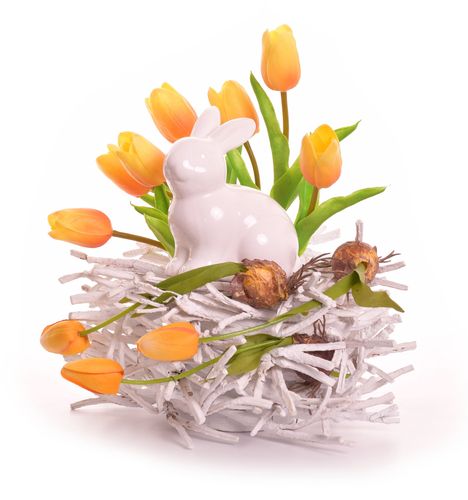 W naczyniu siedzi króliczek obok którego "rosną" tulipany.