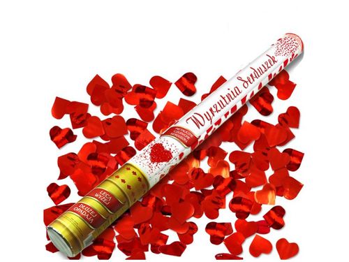 Wystrzałowa tuba konfetti 60cm z czerwonymi serduszkami w środku. Wystrzał następuje dzięki uwolnieniu sprężonego powietrza, wystarczy przekręcić dolną cześć tuby, żeby nastąpił wystrzał jej zawartości. Można ją stosować zarówno wewnątrz pomieszczeń jak i na otwartej przestrzeni.