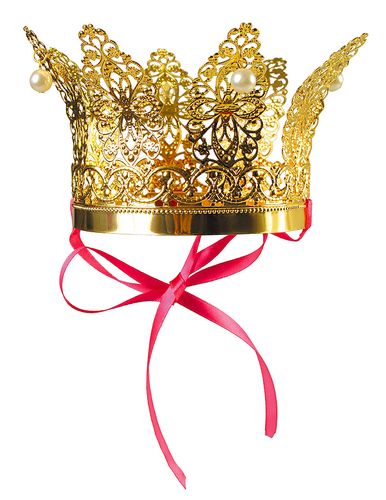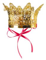 Korona wykonana z metalowego materiału w kolorze złotym ozdobiona perełkami, wiązana pod szyją za pomocą tasiemki.