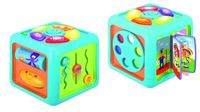 Kostka edukacyjna jest wspaniałą zabawą, posiada książeczkę z trzema plastikowymi karteczkami do odwracania, na których przedstawione są wesołe historyjki. Przekręcając karteczki maluszek usłyszy wesołe melodie i dźwięki. Kolorowe walce - grzechotki, z sympatyczną buźką morskich zwierzątek i kolorowe kuleczki zainteresują każdego brzdąca. Dziecko uczy się kolorów dzięki obrotowej tarczy. Rozwija małe paluszki przez "tor przeszkód" dla motylka, biedronki i pszczółki.