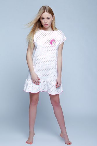 Unikatowa, śliczna, biało-różowa koszulka nocna z jednorożcem na piersi. W kropeczki. Idealna na wiosnę i lato, z krótkim rękawkiem, wykończona falbaną w dolnej części. Zakup wart grzechu! Skład: 100% bawełna.