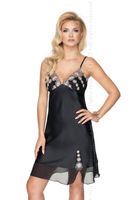 Elegancka, czarna koszulka nocna z satyny, zdobiona subtelnym haftem w modnym kolorze nude. Model o profilowanych miseczkach, bez fiszbin, bardzo kobiecy. Ramiączka cieniutkie, o regulowanej długości. Na udzie ozdobna wstawka. W dolnej części lamówka z delikatnego tiulu. Skład: 98% poliester, 2% poliamid.