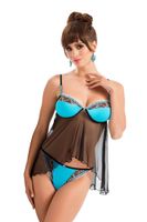Romantyczny, zwiewny, czarno-turkusowy komplecik, w którym Twoje ciało będzie wyglądać sexy. Propozycja dopracowana w każdym szczególe. Śliczne, turkusowe wstawki otula na brzegach piękny, kwiecisty tiul. Koszulka jest bardzo wygodna, posiada regulowane ramiączka i profilowane miseczki o konstrukcji soft. Tiul z efektem prześwitu. Stringi znajdują się w komplecie. Skład: 70% poliamid, 20% wiskoza, 10% elastan.