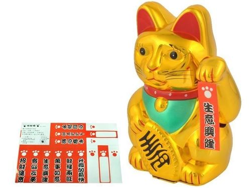 Kultowa figurka kotka przywołującego szczęście i bogactwo. Figurkę należy ustawić w biurze lub domu, przodem do wejścia. Zapewnia ona swojemu właścicielowi powodzenie w interesach oraz sukces w każdym biznesie, odstrasza złe duchy i przyciąga przyjaciół. Figurki szczęśliwych kotków można spotkać w sklepach, mieszkaniach i biurach i są oryginalnym prezentem. Kot porusza ręką, zasilany jedną baterią typu AA (brak w zestawie).